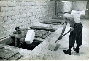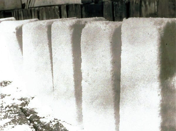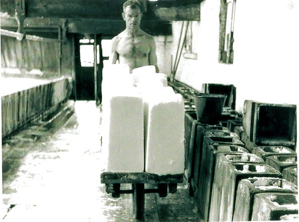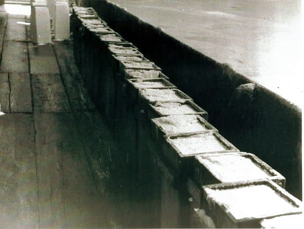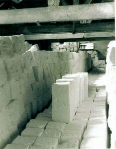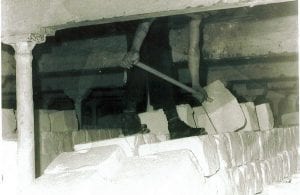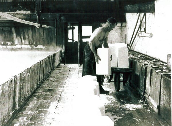 After four days they are laid flat on top of the flues for final storing. Lofters would use spikes to lift the lumps into the dry salt area, above the hot house where they waited to be crushed or cut into blocks.