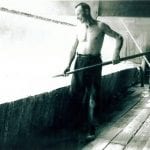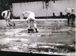 The ‘lumpmen’ would draw the pan with a ‘long handled rake’ (up to 3.5 metres), bringing the salt towards him. Using a skimmer the salt was then scooped and placed in ‘elm tubs’ on the rail known as ‘dogs’. The cooling process begins and the excess brine drains back into the pan.