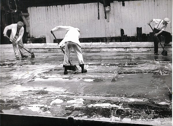 The working week was Monday to Saturday morning, the men worked 12 hour shifts in very hot conditions. Every Monday the pans had to be de-scaled as the build up of salt would retain heat and damage the iron plates. A jigger lifted the pan so that the pan and flues could be checked and repaired if necessary.