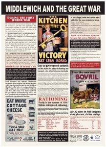 The shortage of labour in farming and transport saw people turning to providing their own food but resulted varied from town and ciuntry. Price controls on staple foodstuffs resulted and the government launched a series of propaganda notices about managing food stocks and recipes, that for the first time, altered the way people used various ingredients. Two of our interpretation boards ‘Middlewich & The Great war’ and ‘Agriculture and Horticulture’ show examples of this and how people coped.