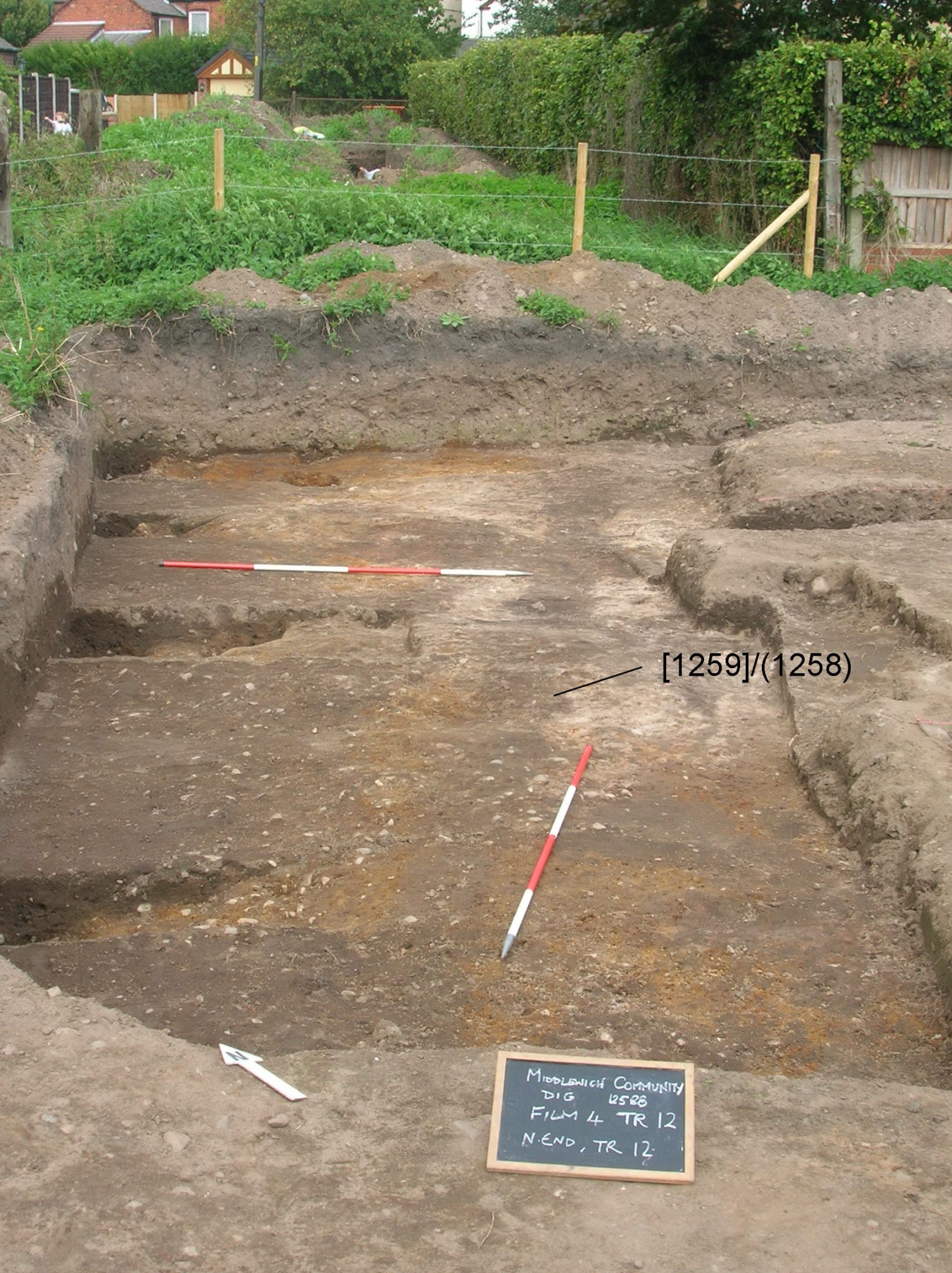 Finally, pit [1273] was situated in the western half of Trench 12, and was seen following the removal of the backfill from John Bestwick’s trench (Figure 20). The pit cut a pre-Roman buried soil (1293), and appeared to be oval in plan though the full extent was not exposed. In section the pit was 3.3m wide and over 0.4m deep, though the full depth was not established due to the high water table.
