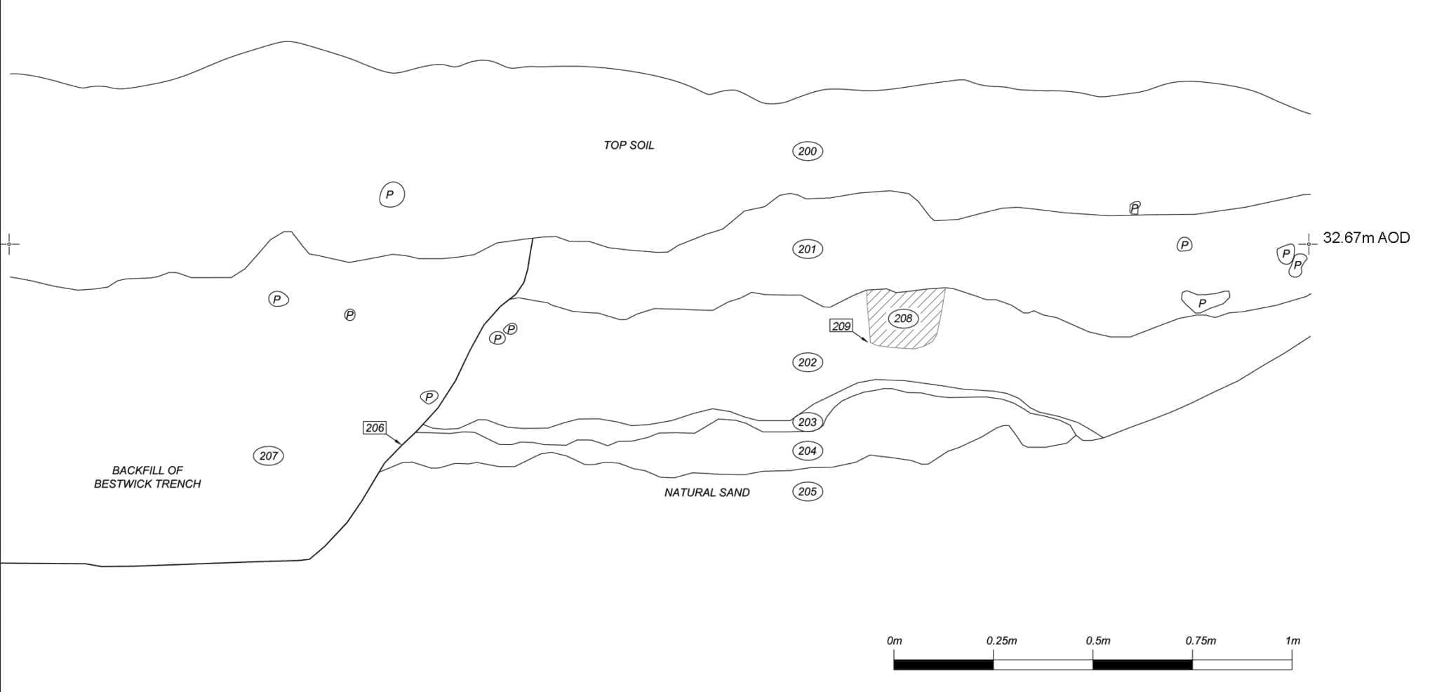 Natural sand was observed in the base of the trench at a depth of around 32.12m AOD, around 0.6m below the existing ground surface. A silty brown subsoil (301=302) overlay the natural, containing frequent small rounded pebbles, flecks of charcoal, and small abraded sherds of Roman pottery. Through metal detection a single piece of lead casting waste was also obtained from this layer. The topsoil (300) overlay (301=302).